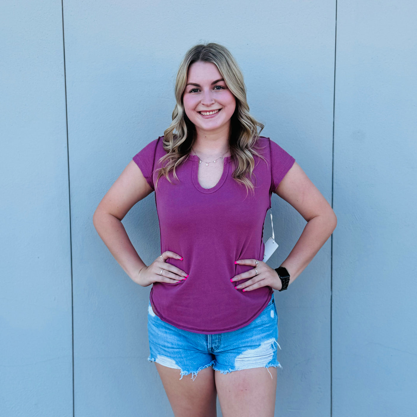 Textured top made out of soft terry fabric. Contrast at the sleeves and finished with a raw edge hem. Back stitch detail.