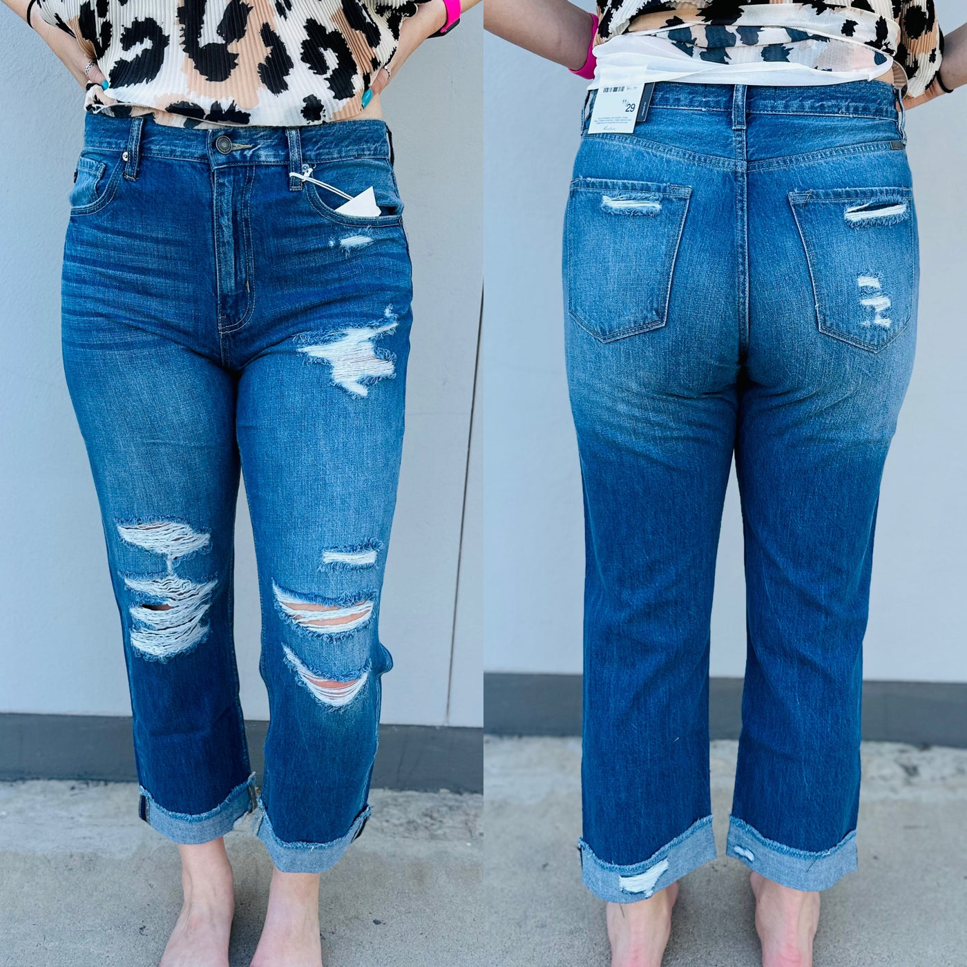 Show off your sleek yet trendy style with our Eloise high-rise straight-leg jeans featuring optimal destruction, fading, whiskering, and cuffed hems. Made with rigid non-stretch denim for a classic authentic denim look. Features a 5 pocket design, a single-button closure, and a zip fly.