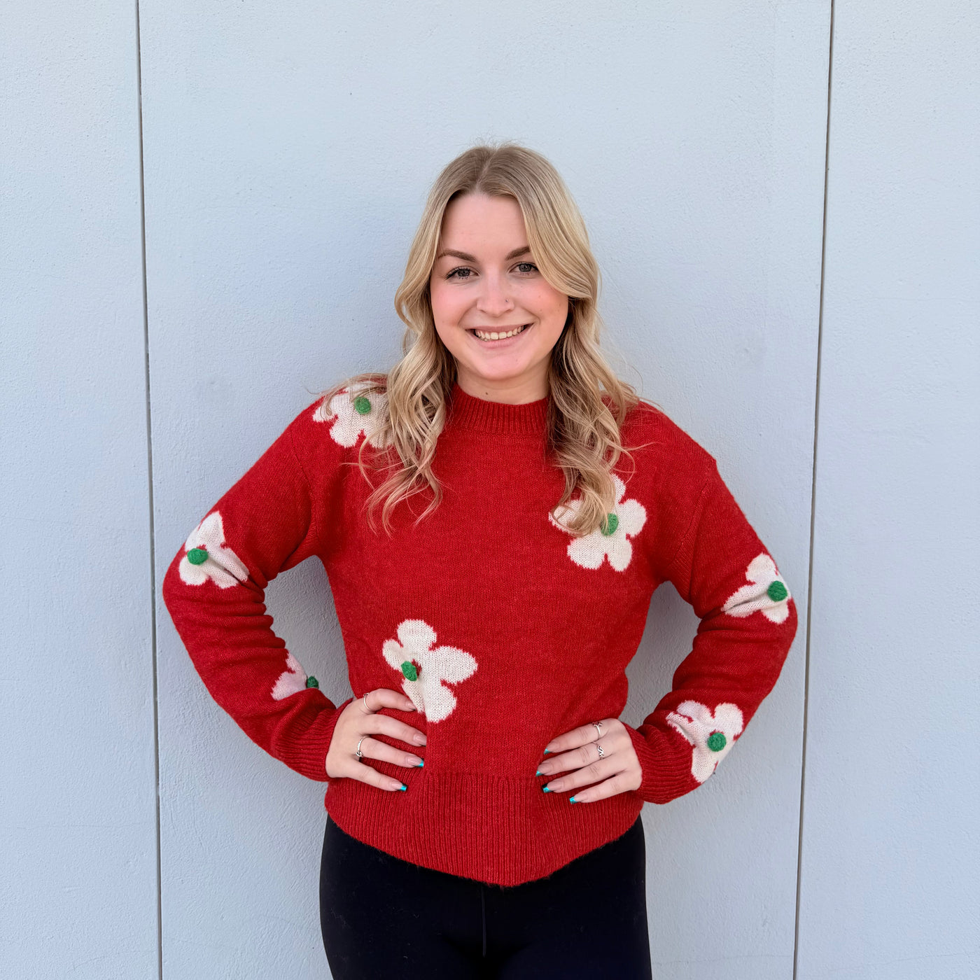 Red & Green Soft Floral Pattern Long Sleeve Mock Neck Sweater